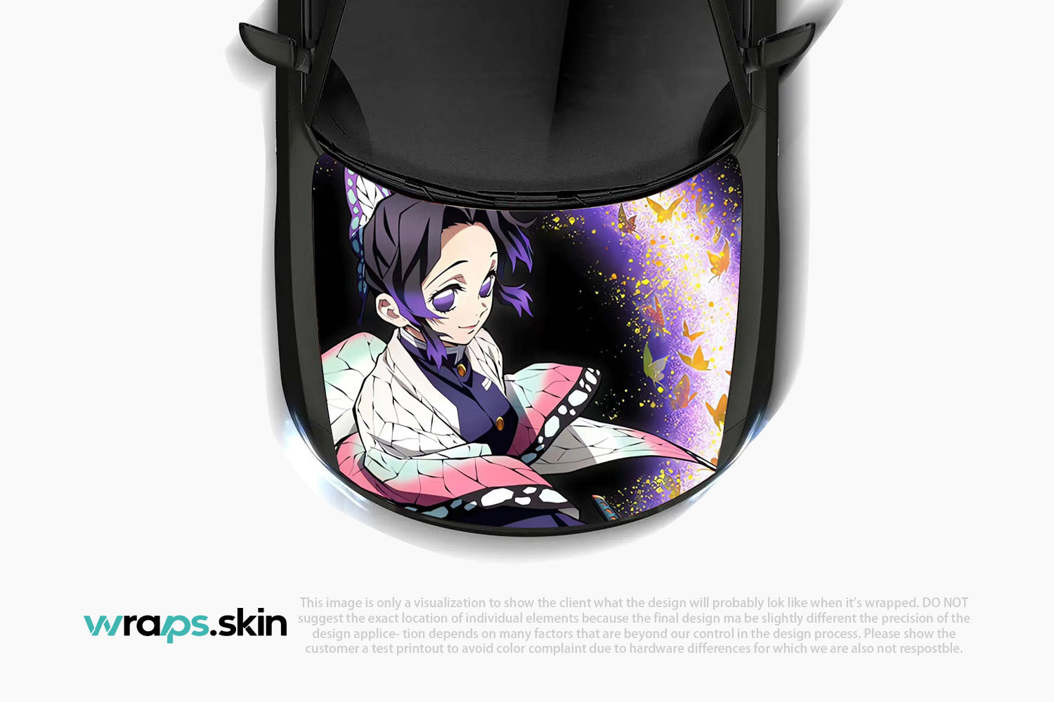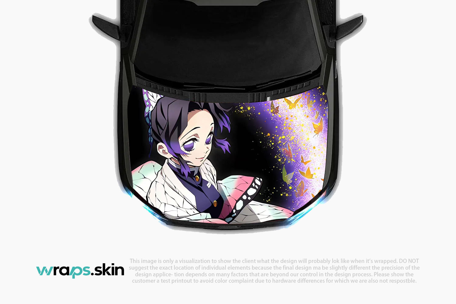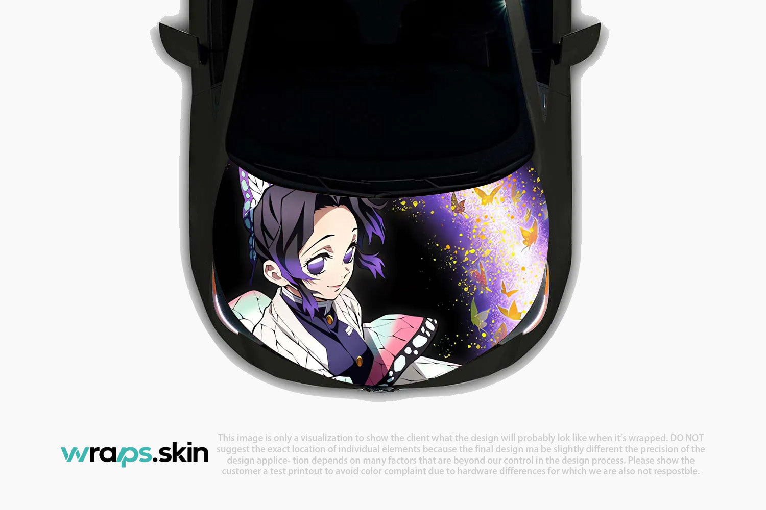 Experience the delicate beauty of this enchanting custom hood wrap featuring a graceful warrior maiden with lustrous dark purple hair and mesmerizing violet eyes that reflect the depths of twilight. Adorned in an elegant white and rose-colored butterfly-patterned haori that symbolizes transformation and renewal, this gentle yet formidable fighter commands the ancient art of insect breathing, surrounded by ethereal purple butterflies that dance against a cosmic starfield backdrop. Note: Final positioning may vary to achieve optimal results.
